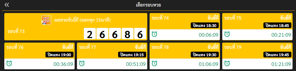 ห้อง จับยี่กี 90 รอบ ห่างกันรอบละ 15 นาที เล่นได้ทั้งวันตั้งแต่ 0:15น รอบแรก ถึงรอบสุดท้าย 0:00น ของอีกวัน
